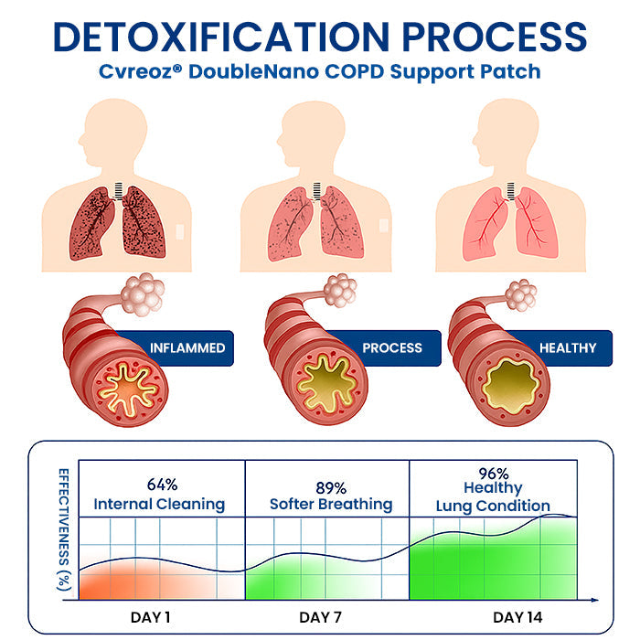 V 12-tedenski klinični študiji z 180 udeleženci z zmerno do hudo KOPB je obliž za podporo pljuč pokazal pomembno izboljšanje pljučne funkcije, dihalne udobnosti in kakovosti življenja. Udeleženci, ki so vsakodnevno uporabljali obliž, so pokazali 32-odstotno povečanje učinkovitosti zajema kisika in 41-odstotno zmanjšanje epizod kašlja in piskanja v primerjavi z placebom. Pljučni testi (PFT) so pokazali izboljšanje indeksov FEV1, medtem ko so CT posnetki pokazali zmanjšanje vnetja dihalnih poti. Ni bilo poročil o resnih stranskih učinkih, kar potrjuje varnost in učinkovitost obliža kot nevazivne dopolnilne terapije za kronične pljučne bolezni.