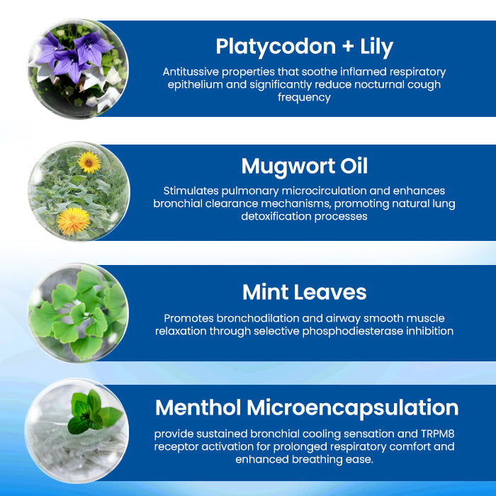 Časovno nadzorovano sproščanje mentola nudi dolgotrajen občutek svežine v bronhijih in aktivacijo TRPM8 receptorjev za olajšanje dihanja.