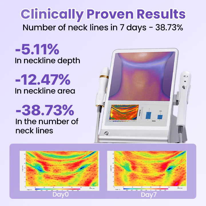 Brez igel, brez operacije, brez invazivnih posegov - dosezite pomlajevanje kože na ravni spa centra kar iz udobja svojega doma! 7-dnevna klinična študija | 1.000 udeležencev | Vse vrste gub na vratu: Napredna analiza kože VISIA je potrdila izjemne rezultate v samo enem tednu: